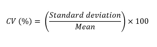 - Calculate the coefficient of variation (CV) by applying:
