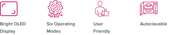 Comfortable and effortless pipetting – Ultra bright OLED display for clear visibility / ergonomic design for fatigue-free operation / comfortable pipetting dial for easy volume control and low strain pipetting (minimises RSI – repetitive strain injury)